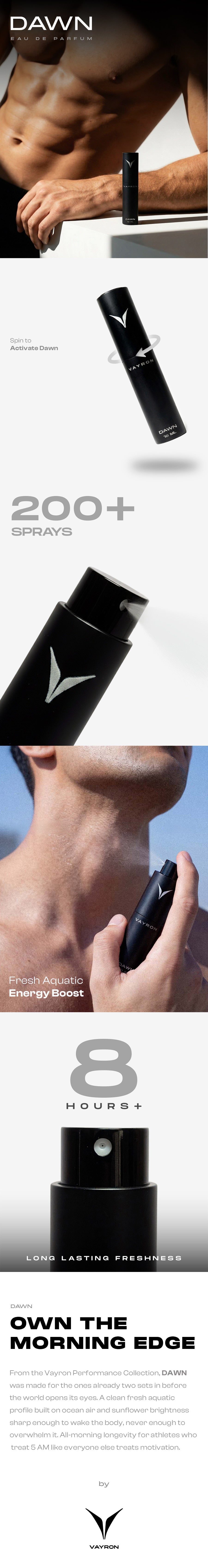 From the Vayron Performance Collection, DAWN was made for the ones already two sets in before the world opens its eyes. A clean fresh aquatic profile built on ocean air and sunflower brightness sharp enough to wake the body, never enough to overwhelm it. All-morning longevity for athletes who treat 5 AM like everyone else treats motivation.