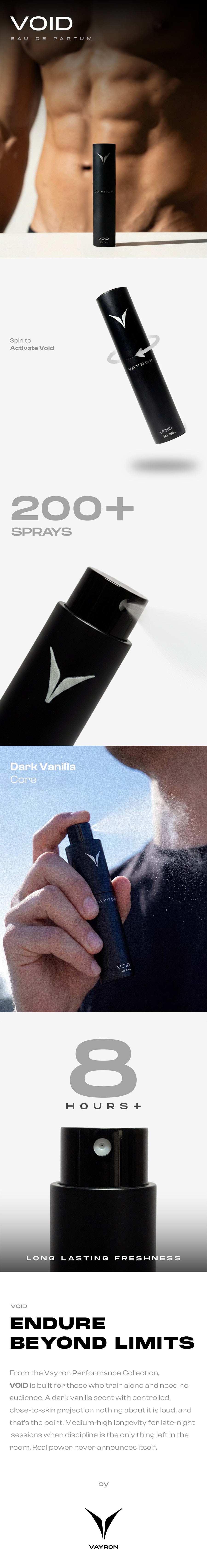 From the Vayron Performance Collection, VOID is built for those who train alone and need no audience. A dark vanilla scent with controlled, close-to-skin projection nothing about it is loud, and that's the point. Medium-high longevity for late-night sessions when discipline is the only thing left in the room. Real power never announces itself.
